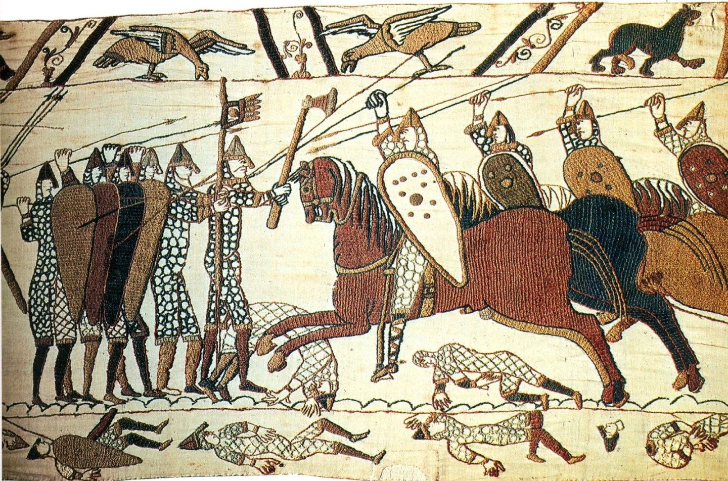 Ma il vero fattore determinante fu la cavalleria, che poteva spazzare facilmente lo scudo rotondi degli Anglosassoni. I Normanni padroneggiavano perfettamente l’arte della cavalleria: disponevano di una sella ad alto schienale, di una doppia cinghia per la sottopancia dei cavalli, di staffe e di briglie per condurre più stabilmente i cavalli. Inoltre i Normanni padroneggiarono una nuova tecnica di attacco: tenere stretta la lancia sotto l’ascella, piegare il braccio, stabilizzare l’arme e partire alla carica. La cavalleria normanna divenne una massa d’urto inarrestabile.