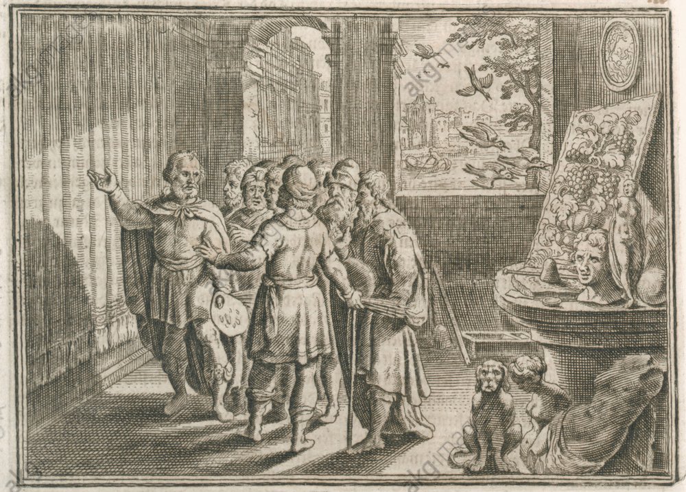 Der griechische Maler Zeuxis soll Weintrauben gemalt haben. die Vögel anlockten. Sein Kontrahent Parrhasios hingegen soll einen Vorhang geschaffen und Zeuxis aufgefordert haben, ihn wegzuziehen, um das dahinter. verborgen Gemälde zu betrachten (Abb. 1). Durch diesen Trick hinters Licht geführt, gestamd Zeuxis seine Niederlage ein, hatte er selbst doch nur Tiere zu täuschen vermocht.